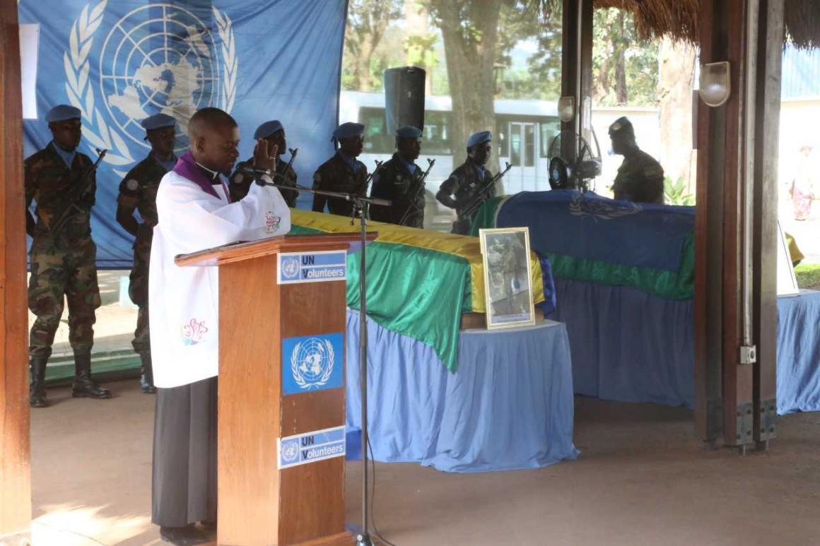 Décédés des suites d’un accident de la route sur l'axe Sibut-Grimari, le 2 octobre 2018, l’adjudant-chef major Alain Stéphane Obiang Nguéma et le Sergent-chef Aymard Achille Bidoumou du bataillon gabonais de la MINUSCA ont reçu, ce vendredi 19 octobre 2018, un dernier hommage. Une cérémonie organisée en leur mémoire au quartier-général de la Mission à Bangui, en présence du Représentant spécial du Secrétaire général des Nations Unies, Parfait Onanga-Anyanga, du Commandant adjoint de la Force, le Général Marco Antonio Mendes Paulino Serronha, ainsi que plusieurs membres des personnels civil, policier et militaire de la Mission.