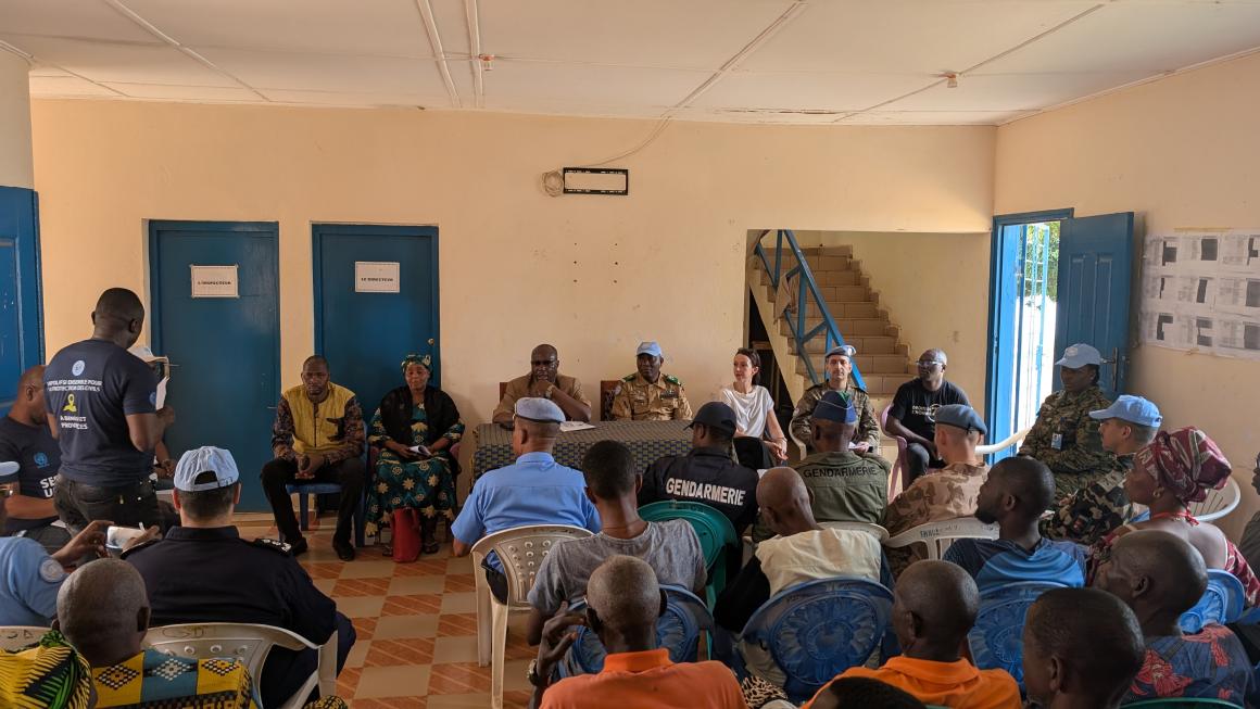 Installé depuis 2023, le poste de la police de la MINUSCA à Mobaye tient un rôle prépondérant dans la protection des civils, aussi bien à l’intérieur de la ville que sur les principaux axes y menant. Partant de leurs observations, fondées sur leur soutien aux forces de sécurité intérieure (FSI) et leurs interactions avec les communautés, les Casques bleus ont choisi d’aborder, au cours de cette semaine, des sujets ayant un impact direct sur la vie des civils, notamment les violences faites aux femmes et aux filles (VBG) et la sécurité routière.