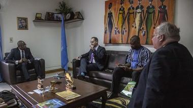 Le Directeur exécutif Florian Irminger de la Penal Reform International (PRI), partenaire d'exécution de la section de la Justice et des affaires pénitentiaires de la MINUSCA, a rencontré le 31 octobre 2019, le Représentant spécial du Secrétaire général, Mankeur Ndiaye, pour l'informer de la stratégie de démilitarisation de l'administration pénitentiaire d'Afrique centrale.