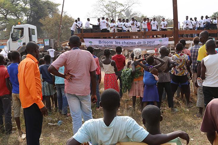 « Brisons les chaines de la peur pour bâtir la paix en Centrafrique ! » C’est en arborant ce slogan que la « Caravane pour la reconstruction et la paix en Centrafrique », initiée par le Ministère centrafricain de la réconciliation nationale, avec le concours du Conseil National de la Jeunesse, l’Union des musiciens de Centrafrique et l’appui déterminant de la MINUSCA, s’est élancée, ce 18 janvier 2015, sur les artères principales de Bangui, en l’occurrence celles qui ont cristallisé, au plus fort des conflits, la violence des groupes armés.