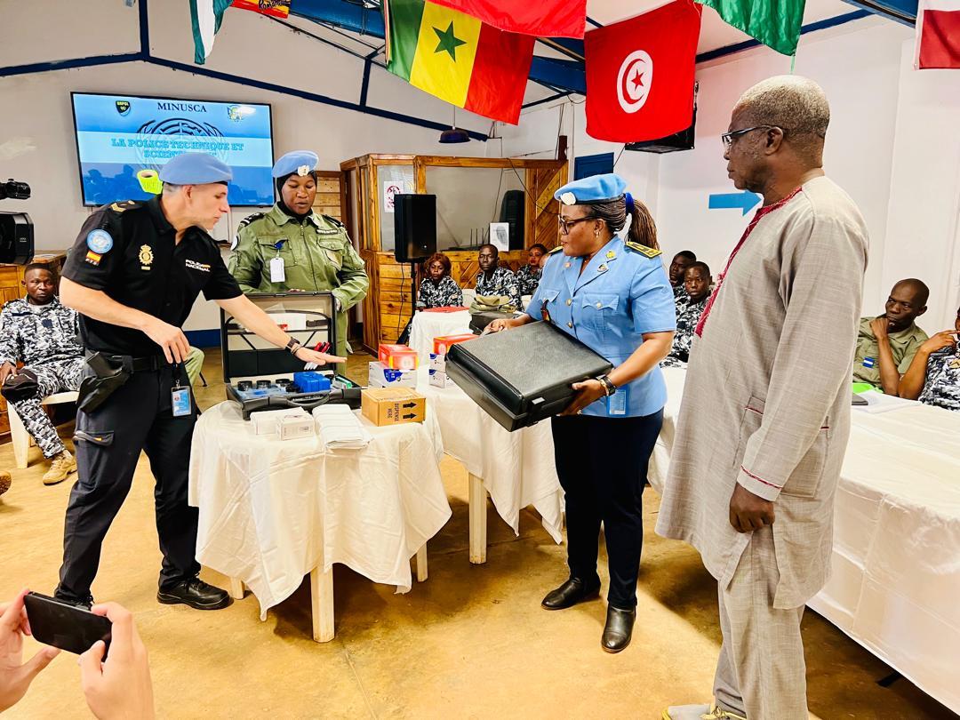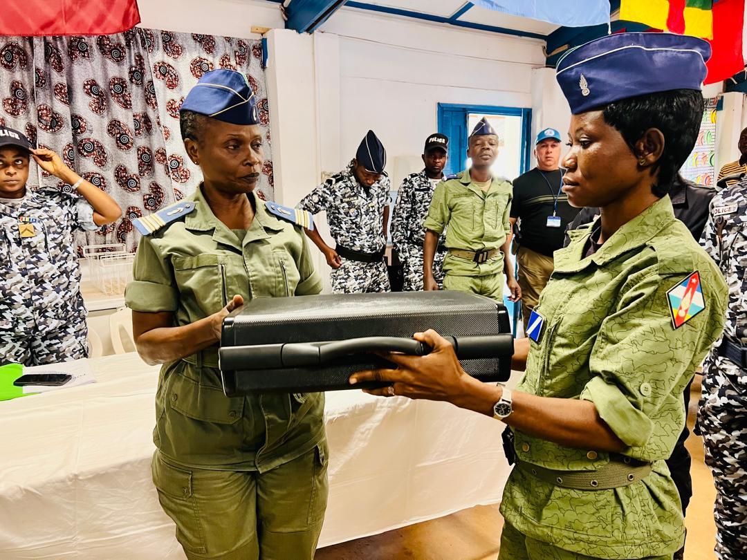À la fin de la formation, du matériel spécialisé a été distribué aux unités locales de la police et de la gendarmerie nationale. Il s’agit de mallettes adaptées à la gestion des scènes de crime, accompagnées d’appareils photo, de fonds d’identification photographique, de mètres déroulants mécaniques, de gants en latex, ainsi que des rubans de balisage.
