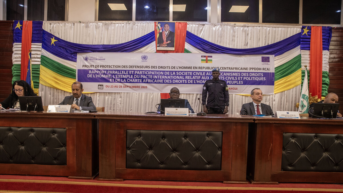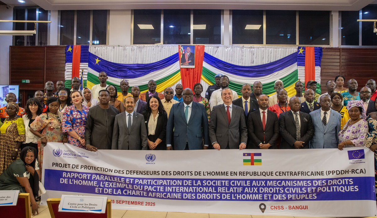 Les défenseurs des droits de l’homme et les membres de la société civile centrafricaine sont désormais outillés pour une meilleure collaboration avec les mécanismes internationaux de défense des droits humains. 50 personnes, dont 25 femmes, des organisations de défense des droits de l’homme de Bangui et des Forums locaux des droits de l’homme (FLDH) issus des 12 préfectures, ont pris part, du 24 au 26 septembre 2025, à un atelier sur « Rapport parallèle et participation de la société civile aux mécanismes des droits de l’homme : l’exemple du Pacte international relatif aux droits civils et politiques et de la Charte africaine des droits de l’homme et des peuples », organisé par la MINUSCA avec l’appui de l’Union européenne.
