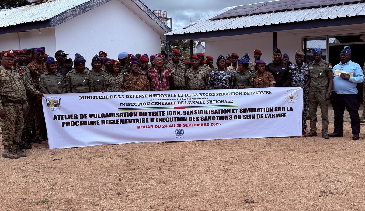 Dans le cadre de la réforme du secteur de la sécurité en République centrafricaine, la MINUSCA appuie l’organisation d’un atelier de vulgarisation du texte de l’Inspection générale de l’armée nationale (IGAN), accompagné d’une sensibilisation et d’une simulation pour mieux comprendre les procédures réglementaires d’exécution des sanctions au sein de l’armée. Présidée par le Gouverneur de la région de l’Équateur, Honoré Kinda, cette activité se déroule du 24 au 29 septembre 2025. Elle vise à renforcer les capacités des militaires de la région et à améliorer l’efficacité de l’armée nationale en matière de gouvernance et de respect de la réglementation.